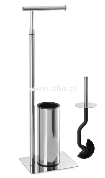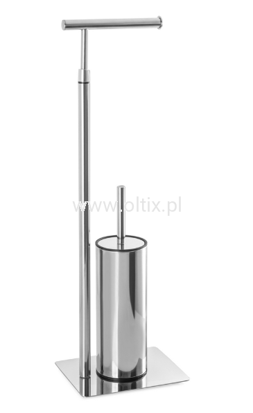 Stojak na papier toaletowy i szczotkę WC wykonany ze stali chromowanej o wysokim, srebrnym połysku to elegancki i funkcjonalny element wyposażenia łazienki. Posiada miejsce na rolkę papieru toaletowego, a na jego podstawie znajduje się pojemnik na szczotkę WC. Szczotka jest wyposażona w estetyczną pokrywę, która skutecznie ukrywa zawartość pojemnika, dbając o higienę i estetykę. Dodatkowym atutem jest specjalnie wyprofilowana rączka szczotki, która zapewnia wygodne użytkowanie i dopasowanie do kształtu muszli. Część czyszcząca w kształcie litery "C" pozwala na skuteczne doczyszczenie krawędzi toalety, zapewniając precyzyjne sprzątanie i higienę.