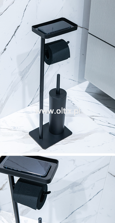 Nowoczesny stojak na papier toaletowy ze szczotką WC oraz funkcjonalną półeczką. Wykonany został ze stali malowanej na kolor czarny o matowym wykończeniu. Posiada stabilną, prostokątną podstawę. Pojemnik na szczotkę toaletową został wyposażony w dodatkowy wkład z tworzywa ułatwiający utrzymanie stojaka w czystości. Półeczka sprawdza się doskonale do odłożenia telefonu komórkowego lub małych akcesoriów higienicznych. Produkt wymaga samodzielnego złożenia.