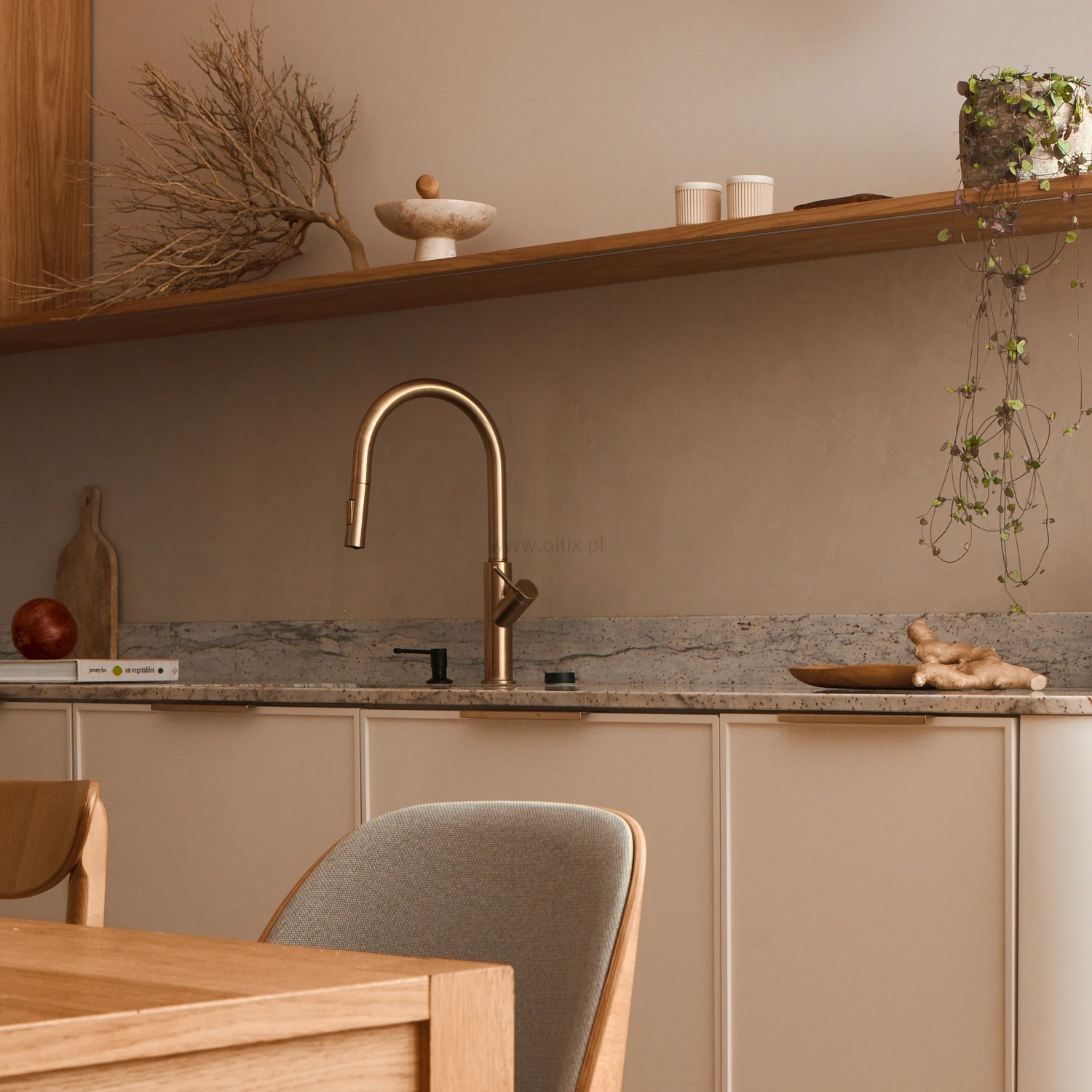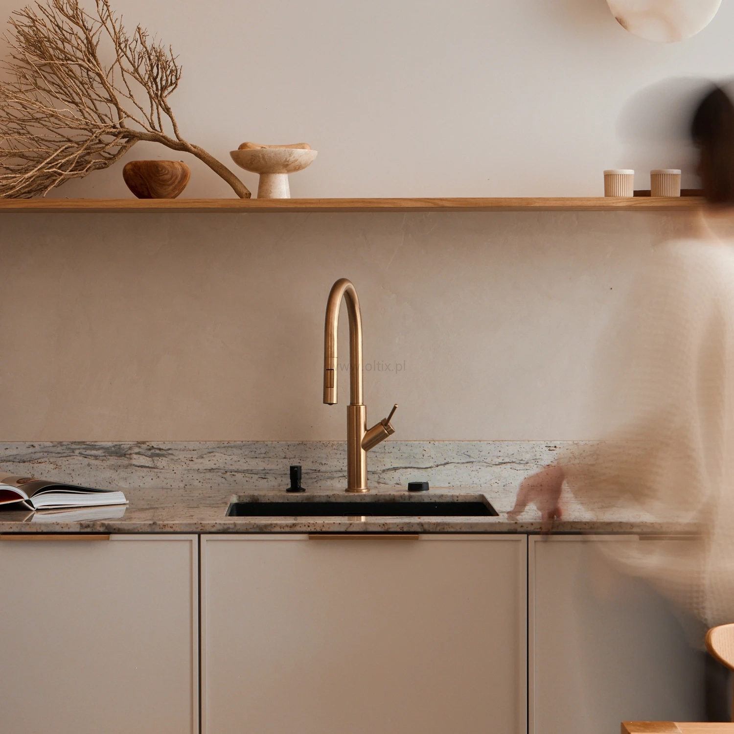 Bateria kuchenna OMNIRES BEND wyróżnia się piękną, minimalistyczną formą opartą na okręgach i łukach. Bateria o wysokości 44,9 cm wyposażona jest w obrotową, wyciąganą wylewkę z 2-funkcyjnym prysznicem, co zwiększa zasięg strumienia wody i wygodę użytkowania. Bateria została wykonana z wysokogatunkowego mosiądzu oraz wyposażona w najwyższej jakości głowicę ceramiczną. Innowacyjne rozwiązania technologiczne zapewniają najwyższy komfort użytkowania oraz pozwalają zredukować zużycie wody o połowę.