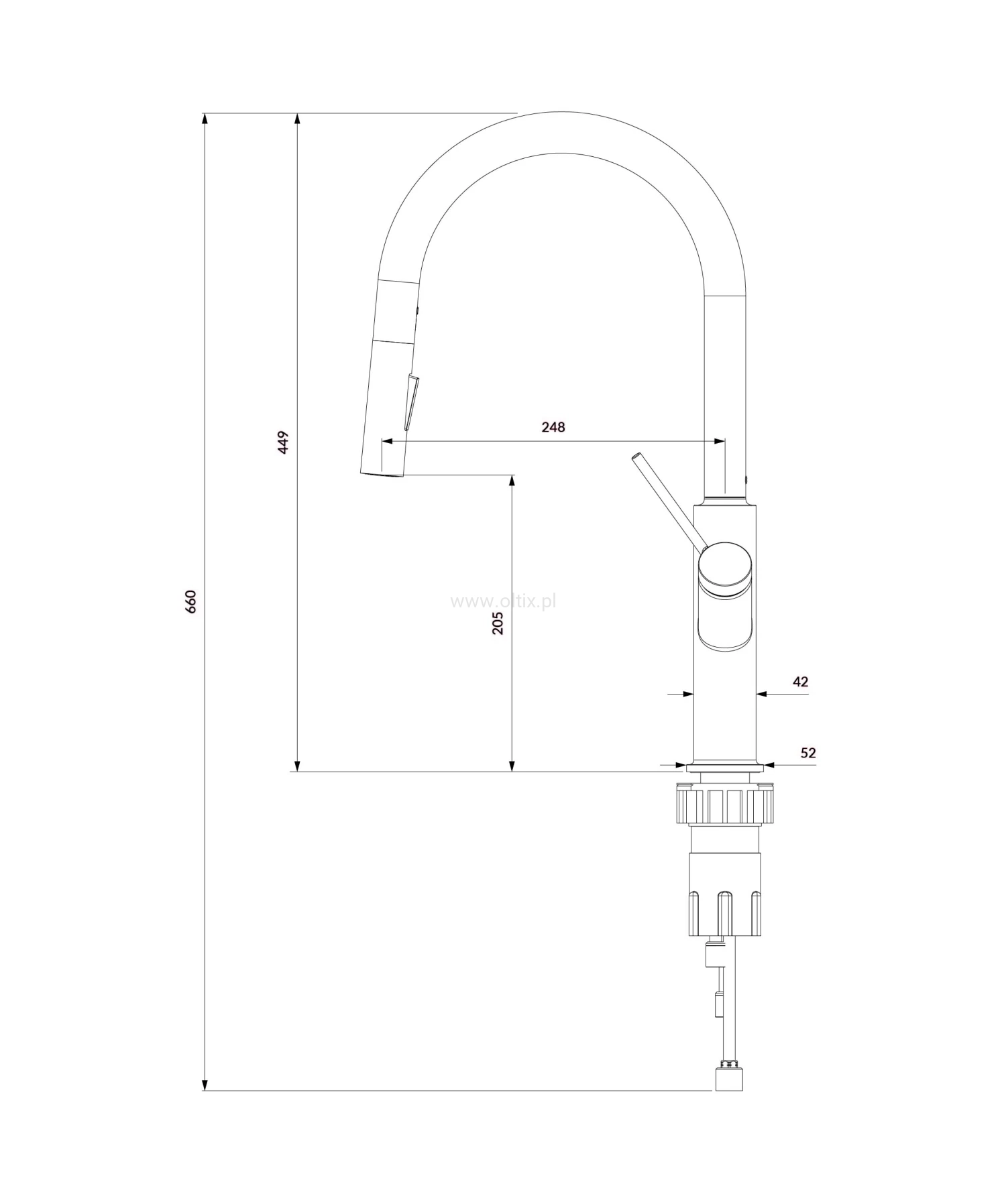 Bateria kuchenna OMNIRES BEND wyróżnia się piękną, minimalistyczną formą opartą na okręgach i łukach. Bateria o wysokości 44,9 cm wyposażona jest w obrotową, wyciąganą wylewkę z 2-funkcyjnym prysznicem, co zwiększa zasięg strumienia wody i wygodę użytkowania.