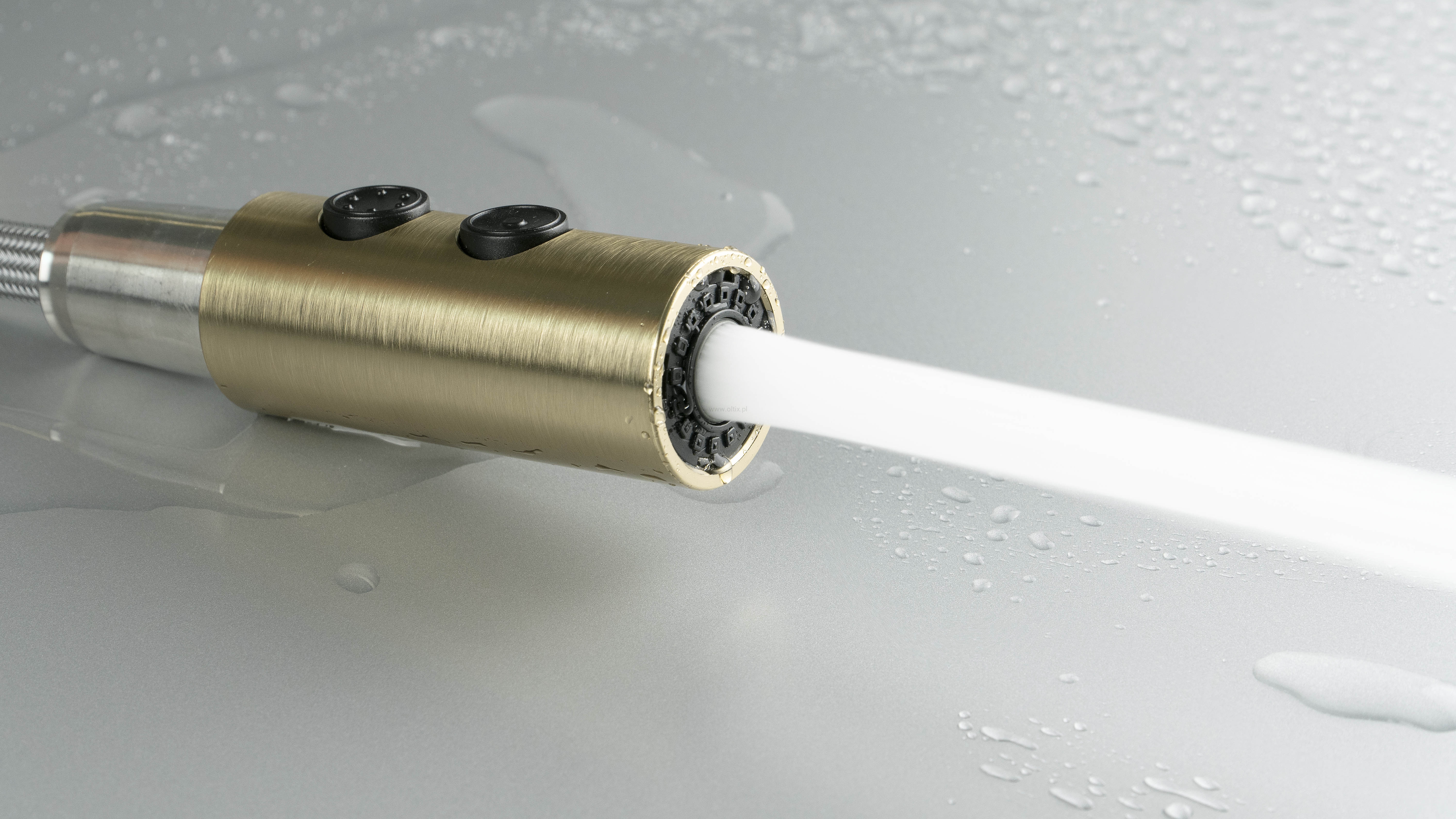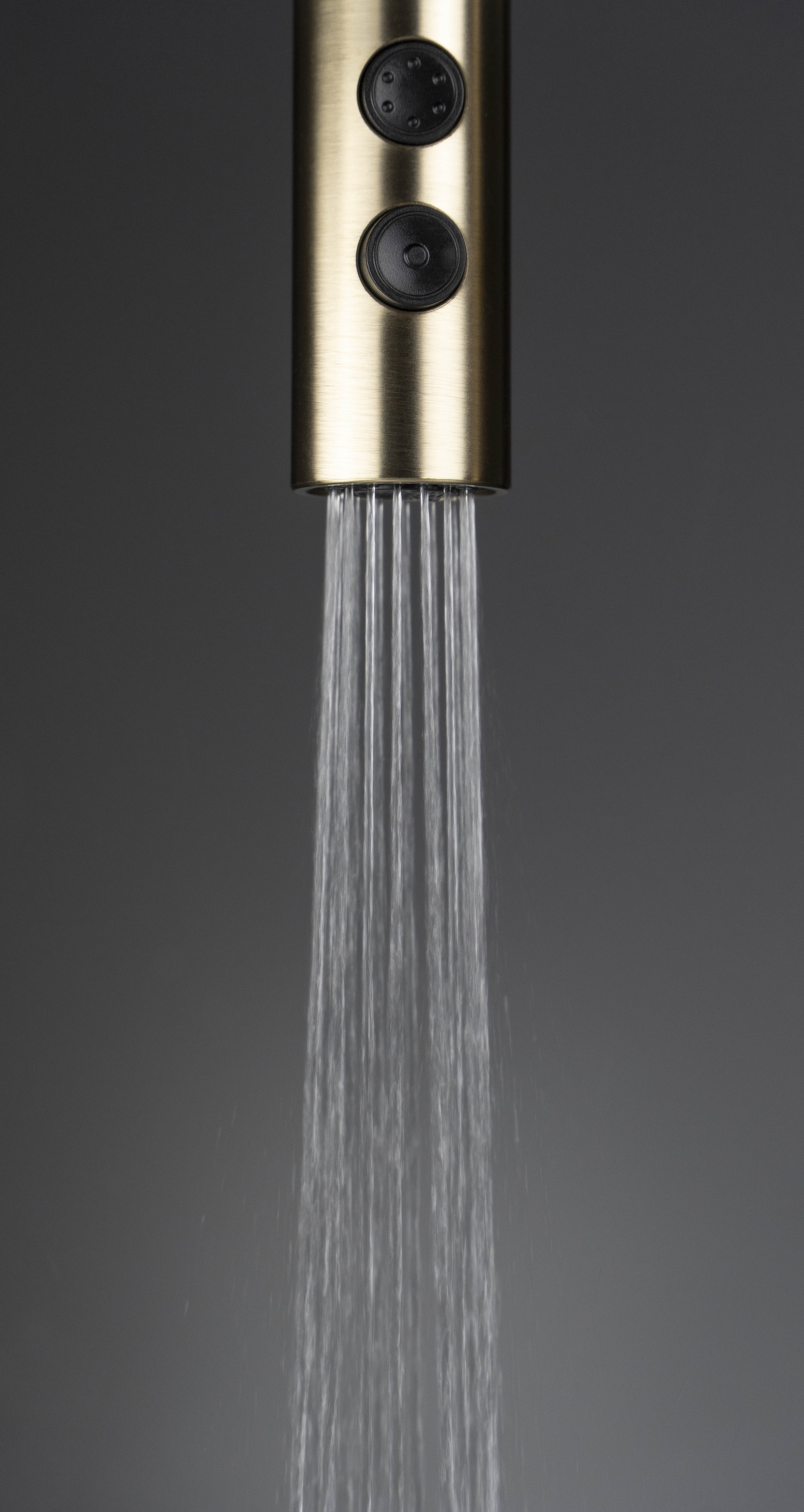 Bateria kuchenna Olfato poprzez połączenie stylu i funkcjonalności, idealnie wpisuje się w potrzeby nowoczesnej kuchni. Jej wyciągana wylewka zapewnia wyjątkową łatwość w utrzymaniu porządku wokół zlewozmywaka. Dwufunkcyjna słuchawka z opcją strumienia napowietrzonego i deszczowego oferuje elastyczność podczas codziennych czynności, takich jak mycie naczyń czy płukanie warzyw i owoców. Wykończenie w kolorze złota szczotkowanego dodaje pomieszczeniu luksusowego charakteru, ale bez zbędnego przepychu.