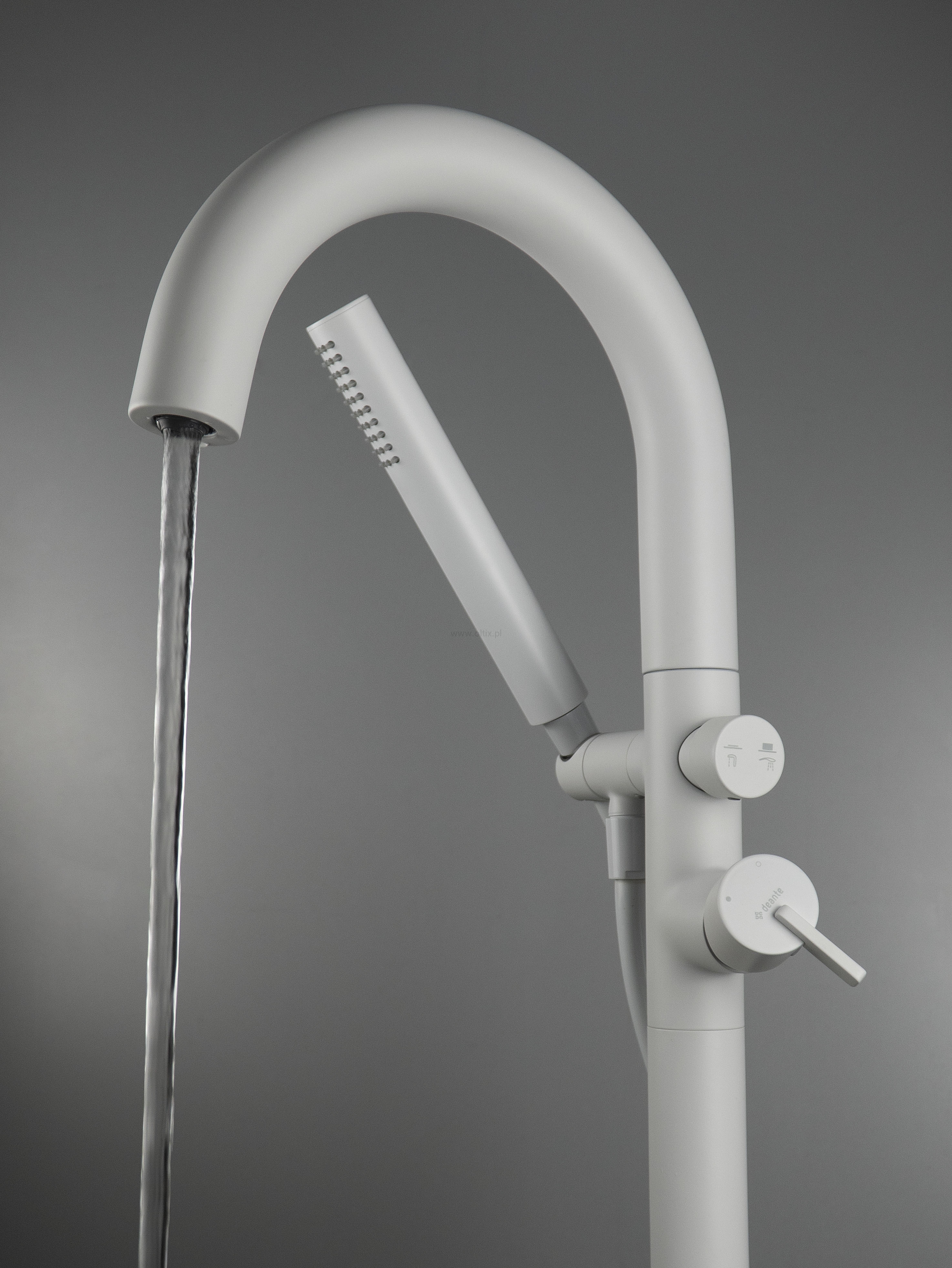 Bateria kolumnowa do wanien wolnostojących w wykończeniu matowe białe Bianco zachwyca subtelnością i minimalistycznym designem. Wylewka w kształcie litery „U” doskonale wpisuje się w nowoczesne trendy, dodając elegancji i harmonii każdej łazience. Wyposażona w wąż z systemem Anti-Twist, zapobiegający skręcaniu, oraz słuchawkę prysznicową o delikatnym strumieniu deszczowym, bateria zapewnia wyjątkowy komfort użytkowania. Mosiężny korpus i ceramiczna głowica gwarantują niezawodność i trwałość produktu. Regulowany kąt nachylenia słuchawki oraz precyzyjny, ceramiczny przełącznik funkcji czynią model nie tylko estetycznym, ale również bardzo praktycznym. Matowe białe wykończenie podkreśla świeżość i czystość formy.