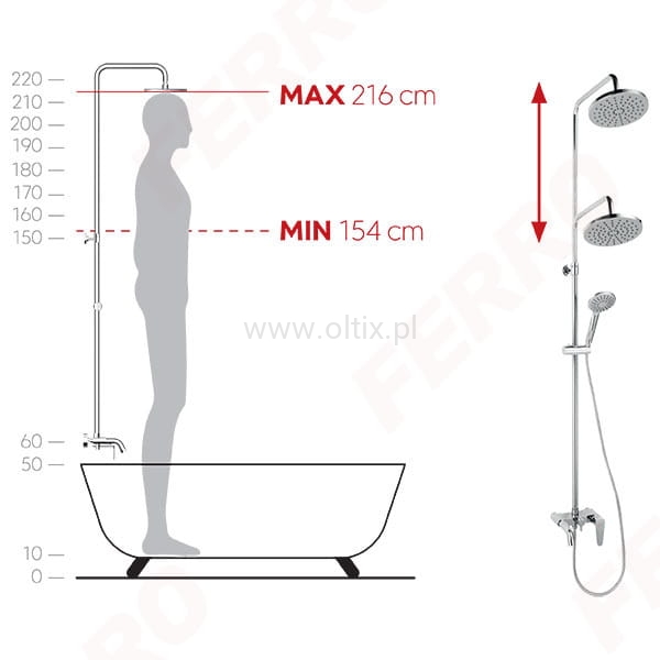 Zestaw Fiesta jako jeden z niewielu takich produktów na rynku posiada regulowaną wysokość deszczowni, aż do 206 cm od dna wanny. Warto o tym pamiętać przy wyborze produktu. Gwarantuje to komfort korzystania z natrysku również wysokim osobom. Minimalna wysokość ustawienia deszczowni to nawet 144 cm.