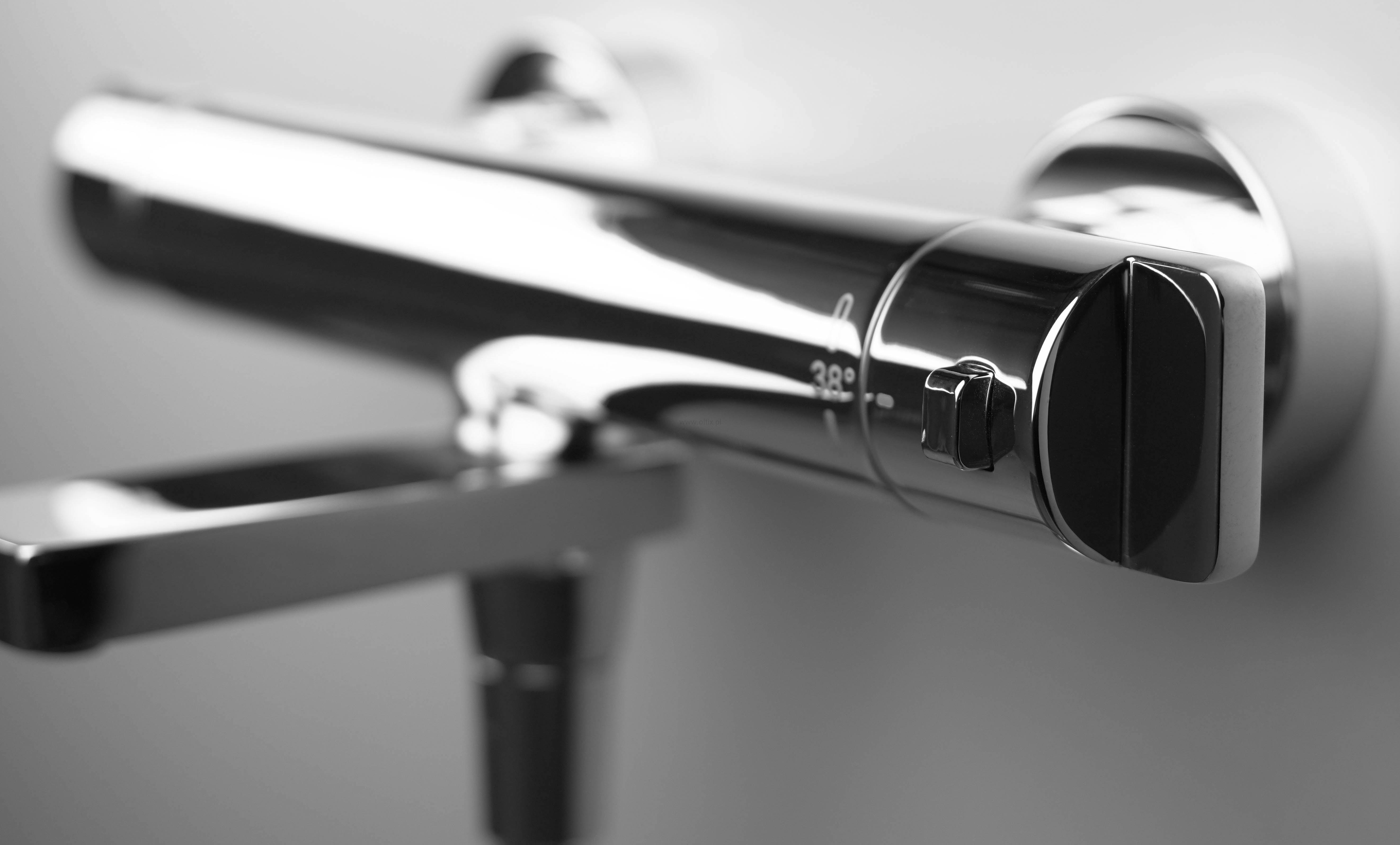Bateria posiada blokadę 38˚C, przez co zapobiega przypadkowemu zwiększeniu temperatury, zapewniając maksymalnie komfortową kąpiel. Aby uruchomić wodę cieplejszą lub chłodniejszą niż 38°C, trzeba najpierw przycisnąć przycisk na pokrętle. Termostat gwarantuje utrzymanie stabilnej temperatury wody, nawet gdy w instalacji występują skoki ciśnienia.