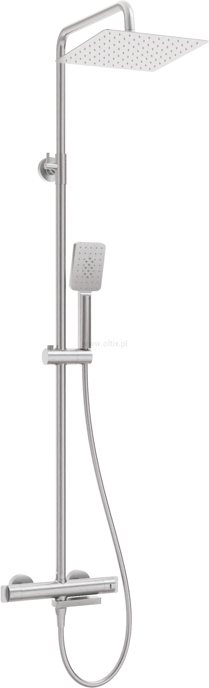 Deszczownia z termostatyczną baterią wannową łączy w sobie design z funkcjonalnością i bezpieczeństwem. Jest wyposażona w ruchomą wylewkę, która pełni też rolę przełącznika natrysku. Zabezpieczenie przed przekroczeniem 38 stopni chroni przed niespodziewanym poparzeniem, gwarantując komfort podczas kąpieli. Estetyczne i ergonomiczne pokrętła umożliwiają dokładne sterowanie, a ultracienka głowica prysznicowa oraz 3-funkcyjna słuchawka mają wbudowany system anti-calc, który chroni przed osadzaniem kamienia, zapewniając długowieczność produktu. Wykończenie w kolorze stali szczotkowanej dodaje łazience elegancji i współczesnego stylu.