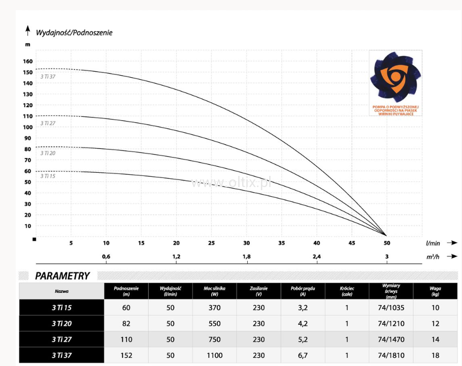 3 calowe wielostopniowe pompy głębinowe o średnicy 74 mm z podwyższoną odpornością na piasek, przeznaczone do studni 3 i 4 calowych. Efekt podwyższonej odporności na piasek osiągnięto dzięki zastosowaniu „wirników pływających” oraz doborowi materiałów odpornych na zużycie: mosiądz, stal nierdzewna AISI 304 oraz wysokiej jakości tworzywa. Kondensator pompy został zabudowany w silniku dzięki czemu instalacja elektryczna jest znacznie prostsza niż w przypadku pomp z puszką rozruchową. Pompy dostępne z 1,5 m odcinkiem kabla lub z 20 metrowym fabrycznym kablem zakończonym wtyczką. Pompy wyposażone zostały w zabezpieczenie termiczne zamontowane w uzwojeniu silnika. Pompy z serii 3”Ti dzięki swojej bezawaryjnej pracy i wysokim parametrom zyskały miano jednych z najczęściej montowanych 3” pomp w Polsce.