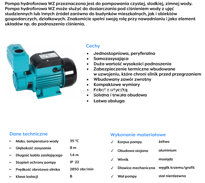 Pompa WZ 750 z osprzętem ze względu na kompaktowe rozmiary, łatwość transportowania i demontażu oraz ze względu na uzyskiwany wysoki parametr ciśnienia bardzo często wybierana jest jako zestaw dla "działkowców". Pompa przeznaczona jest do zaopatrywania w wodę pod ciśnieniem domów jednorodzinnych, podlewania z węża lub podłączenia do systemów nawadniania oraz podnoszenia ciśnienia w instalacji. W połączeniu ze zbiornikiem przeponowym (optymalnie 24, 50 litrów) tworzy kompletny zestaw hydroforowy. WZ 750 jest pompą samozasysającą, w przypadku pierwszego uruchomienia wystarczy zalać wodą korpus a pompa sama wytworzy podciśnienie ułatwiające zassanie wody pod warunkiem, że lustro wody w źródle znajduje się na głębokości nie niższej niż 8m od miejsca posadowienia pompy.