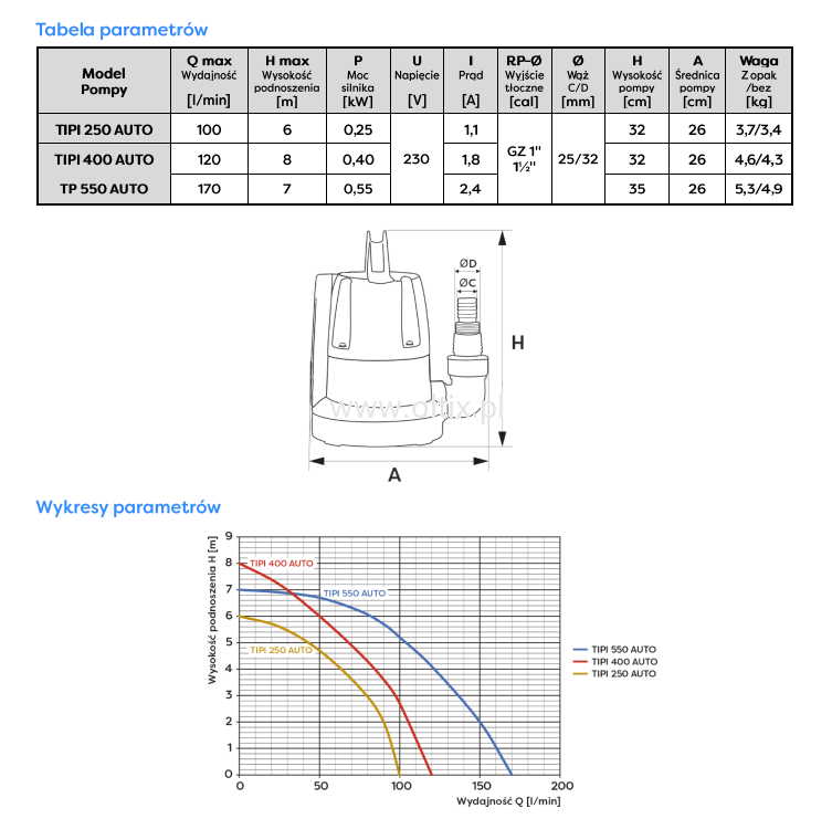Pompa TIPI 400AUTO jest pompą zatapialną przeznaczoną do pompowania czystej, zimnej wody, oraz wody szarej zawierającej zanieczyszczenia organiczne o maksymalnej średnicy nie przekraczającej 5mm. Pompa TIPI 400AUTO zamiast tradycyjnego sterowania pływakowego posiada wbudowany pływak, który umożliwia zastosowanie jej w wąskich otworach studziennych i rewizjach. Sterowanie pracą pompy odbywa się poprzez suwak na korpusie którym ustala się poziom załączania urządzenia. W trybie auto pompa uruchamia się, gdy poziom cieczy osiągnie wysokość zaznaczoną suwakiem. TIPI 400 dzięki specjalnemu rozwiązaniu komory hydraulicznej wypompowuje wodę prawie do dna podłoża na którym jest postawiona. Jest to cecha cenna wszędzie tam, gdzie w zalanej powierzchni brak jest studzienki rewizyjnej.