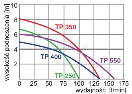Pompa TP 550 przeznaczona jest do pompowania czystej, zimnej wody ze studni kręgowych i zbiorników oraz wody szarej zawierającej zanieczyszczenia o maksymalnej średnicy nie przekraczającej 35mm. Stosuje się ją również często do wypompowywania wody z zalanych pomieszczeń. Pompa posiada sterowanie pływakowe które w zależności od poziomu pompowanej cieczy steruje jej załączaniem i chroni przed pracą na sucho..