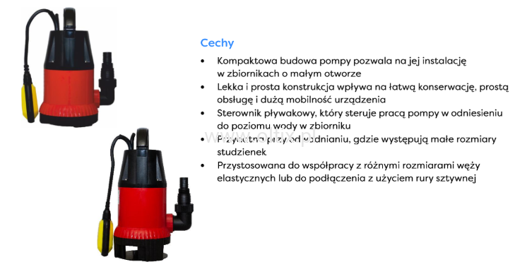 - Sterownik pływakowy, który steruje pracą pompy w odniesieniu do poziomu wody w zbiorniku