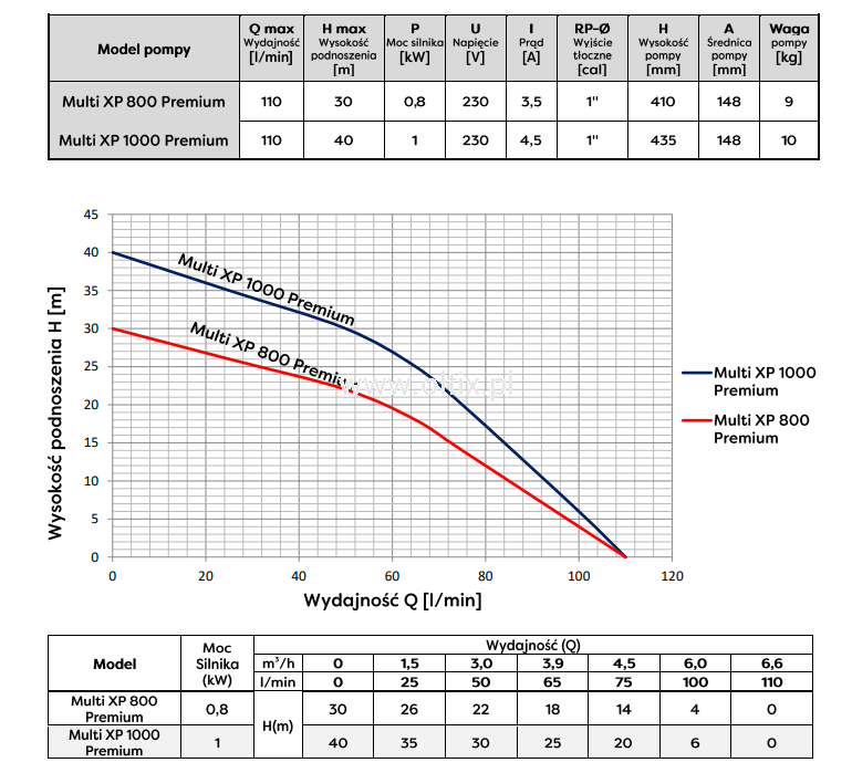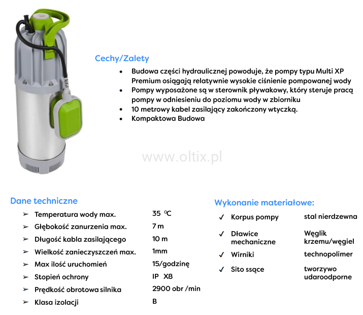 Pompy zatapialne Multi XP Premium, przeznaczone są do tłoczenia czystej lub lekko zanieczyszczonej słodkiej, zimnej wody ze studni kręgowych oraz innych zbiorników. Pompy Multi XP Premium przeznaczone są do zastosowań wszędzie tam gdzie ich parametry hydrauliczne i techniczne są właściwe i zgodne z oczekiwaniami użytkownika. Ze względu na wysoki parametr podnoszenia Multi XP Premium często wykorzystywane są do podlewania.