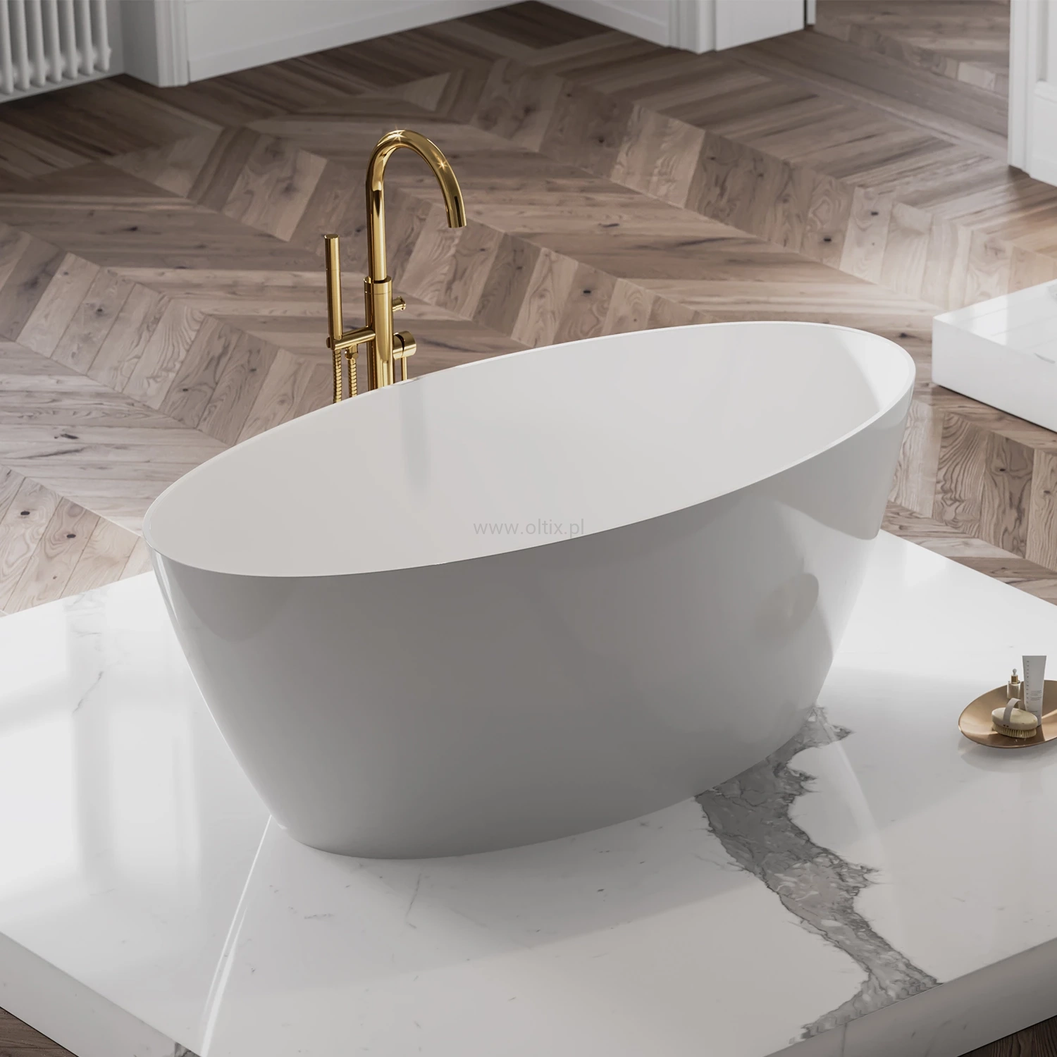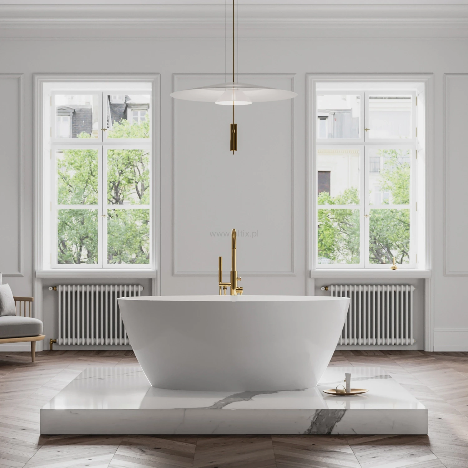 Naturalnie odbijająca światło, połyskująca powierzchnia wanny została wykończona w klasycznym kolorze bieli.