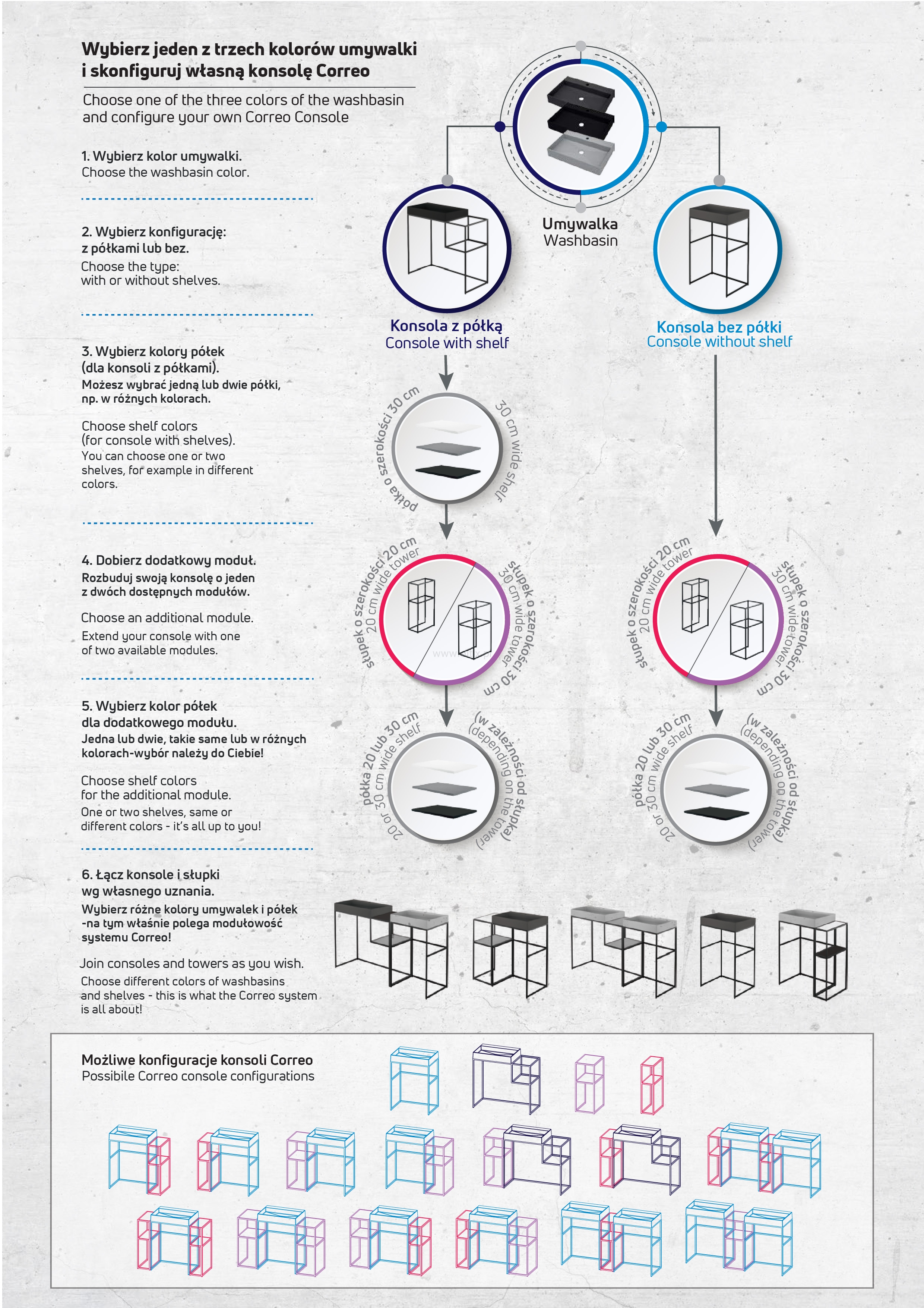 Skonfiguruj swój własny zestaw, łącząc dowolne elementy i kolory. Poszczególne produkty można łączyć według własnego uznania i wyobraźni, co pozwala uzyskać rozmaite rezultaty stylistyczne i daje możliwość błyskawicznej metamorfozy łazienki. Specjalna konstrukcja węższego słupka umożliwia powieszenie go nawet na ścianie. Zróżnicowane wymiary, szeroka paleta odcieni i klasyczny, wspólny design pomogą stworzyć wyjątkową kompozycję.