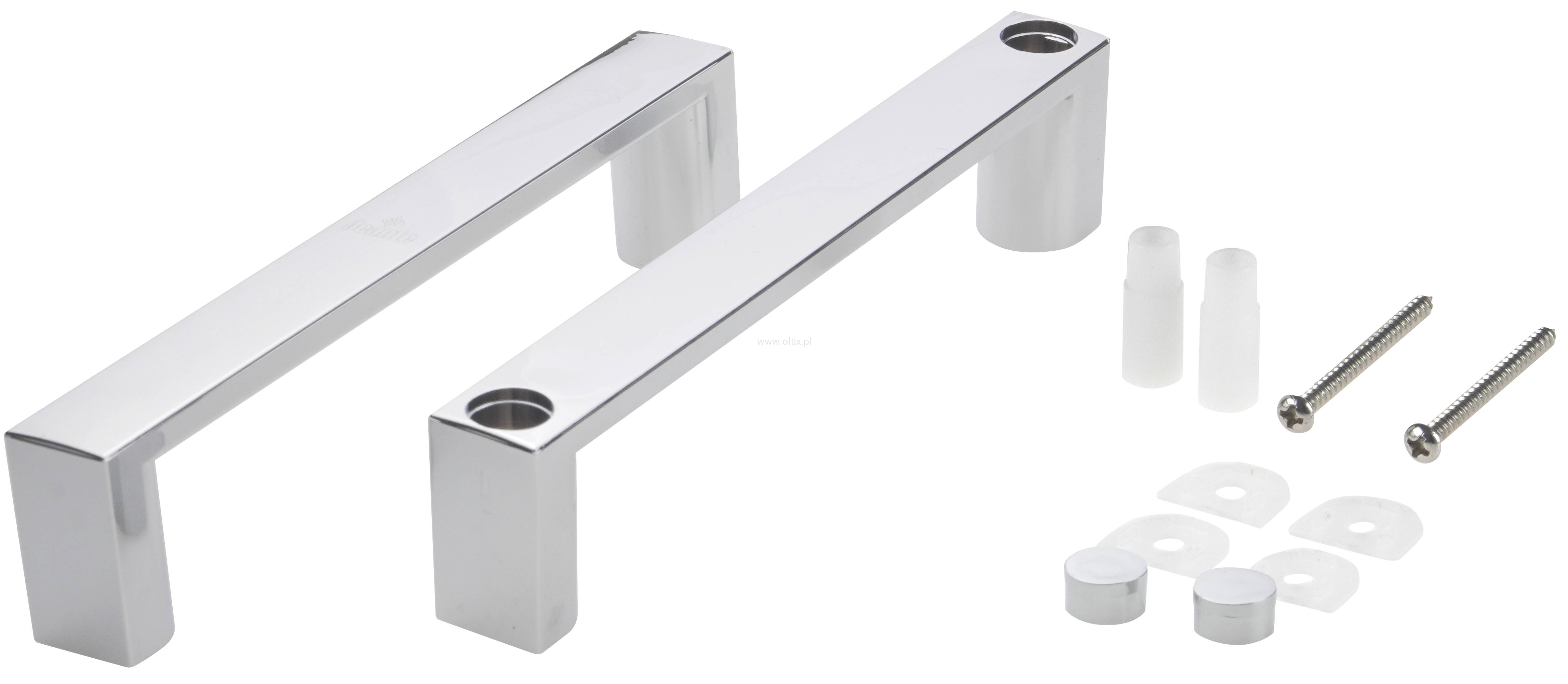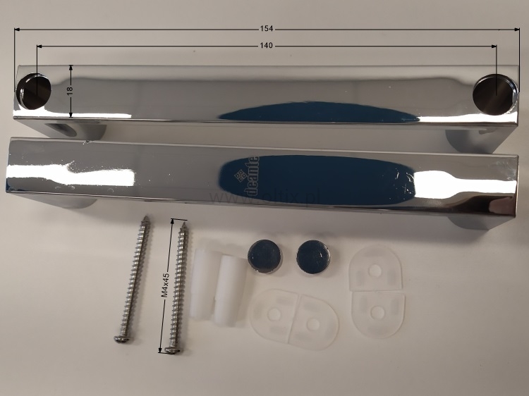 Komplet uchwytów do wymiany w drzwiach kabiny prysznicowej. Uchwyty są wyposażone w otwory montażowe o średnicy 4mm, a rozstaw między nimi wynosi 140mm. Wykończenie są w eleganckim, błyszczącym chromie.