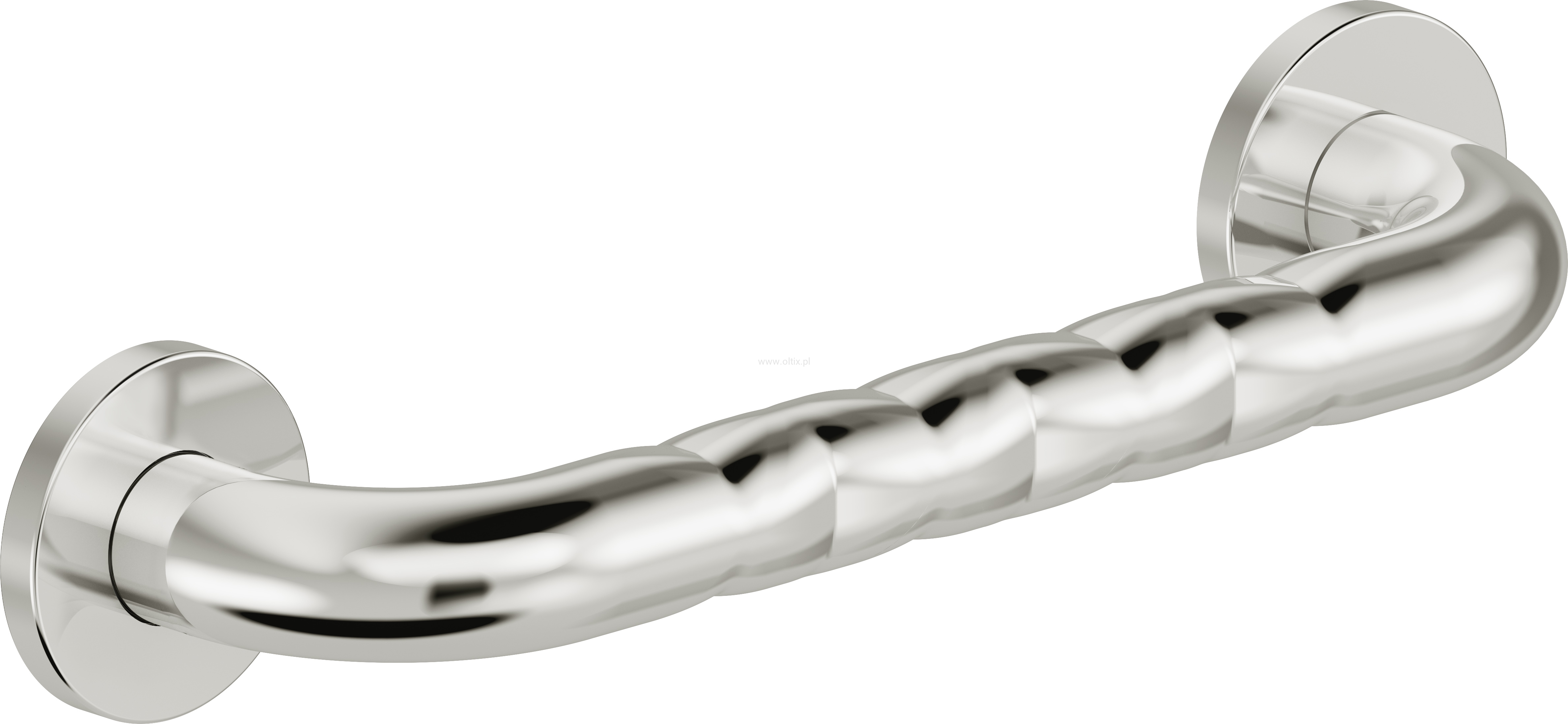 Uchwyt przyścienny wykonany ze stali nierdzewnej o długości 30 cm. Stalowe rozety mają średnicę 70mm. Uchwyt ma powierzchnię falistą. W komplecie zestaw montażowy do twardego podłoża (ściany z pełnej cegły/ betonu). Maksymalny udźwig 150 kg. Produkt jest wyrobem medycznym.