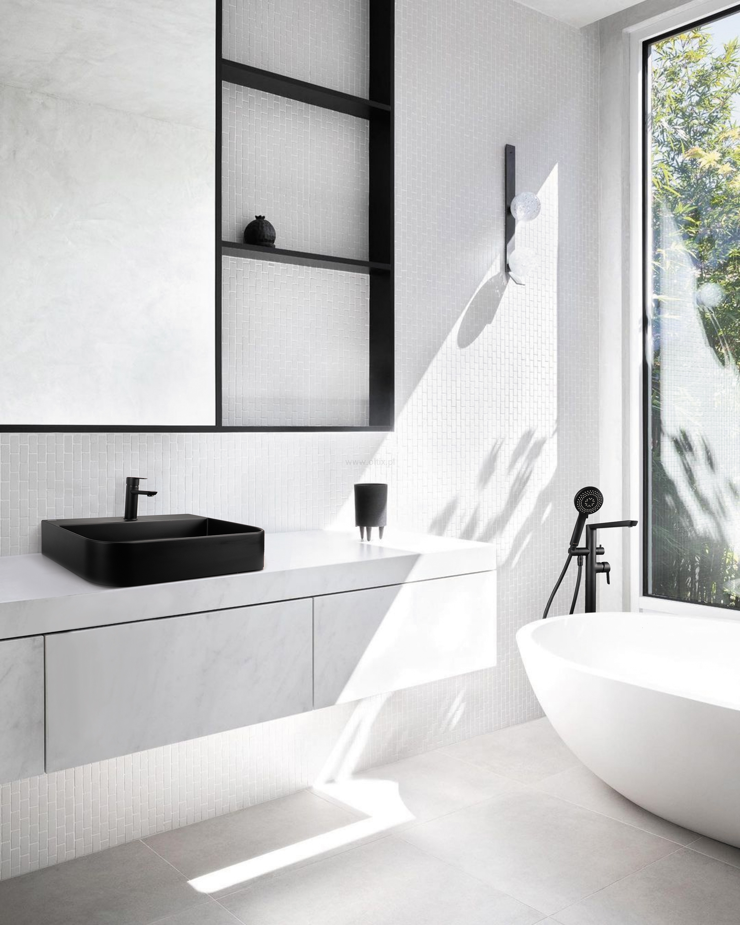 Umywalka granitowa z maskownicą przelewu w kolorze nero charakteryzuje się nowoczesnym i eleganckim designem. Posiada zaoblone brzegi z przodu, co nadaje jej miękki, estetyczny wygląd i zwiększa komfort użytkowania. Wykonana z granitu Deante, jest odporna na uderzenia, wysoką temperaturę, przebarwienia oraz szok termiczny. Powierzchnia umywalki dzięki właściwościom hydrofobowym odpycha cząsteczki wody, co ułatwia utrzymanie jej w czystości. Natomiast jony srebra dodane do masy, zapewniają działanie antyseptyczne. Maskownica przelewu, precyzyjnie dopasowana do granitu w odcieniu nero, podkreśla elegancję i spójność całej formy. Głęboka, czarna barwa oraz zaoblony kształt doskonale pasuje do czarnej armatury o obłych kształtach. Umywalka posiada jedno podfrezowanie pod baterię.