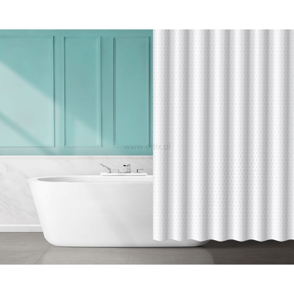 Biała zasłona prysznicowa wykonana z trwałego poliestru, ozdobiona subtelnym wzorem małych rombów, to elegancki i stylowy dodatek do każdej łazienki. Delikatny wzór dodaje jej charakteru, jednocześnie zachowując minimalistyczny wygląd. Zasłona ma wymiary 200 cm wysokości i 180 cm szerokości, co zapewnia pełne osłonięcie przestrzeni prysznicowej. Górna część zasłony wyposażona jest w otwory na kółeczka, umożliwiające łatwy montaż na drążku prysznicowym. Zasłona jest odporna na wilgoć, dzięki czemu idealnie sprawdzi się w codziennym użytkowaniu. W zestawie znajduje się 12 białych kółek do zwieszenia. Zasłonka prysznicowa tekstylna nadaje się do delikatnego prania w 30 stopniach oraz prasowania w niskiej temperaturze. Nie czyścić chemicznie, nie wybielać, nie suszyć w suszarce bębnowej.
