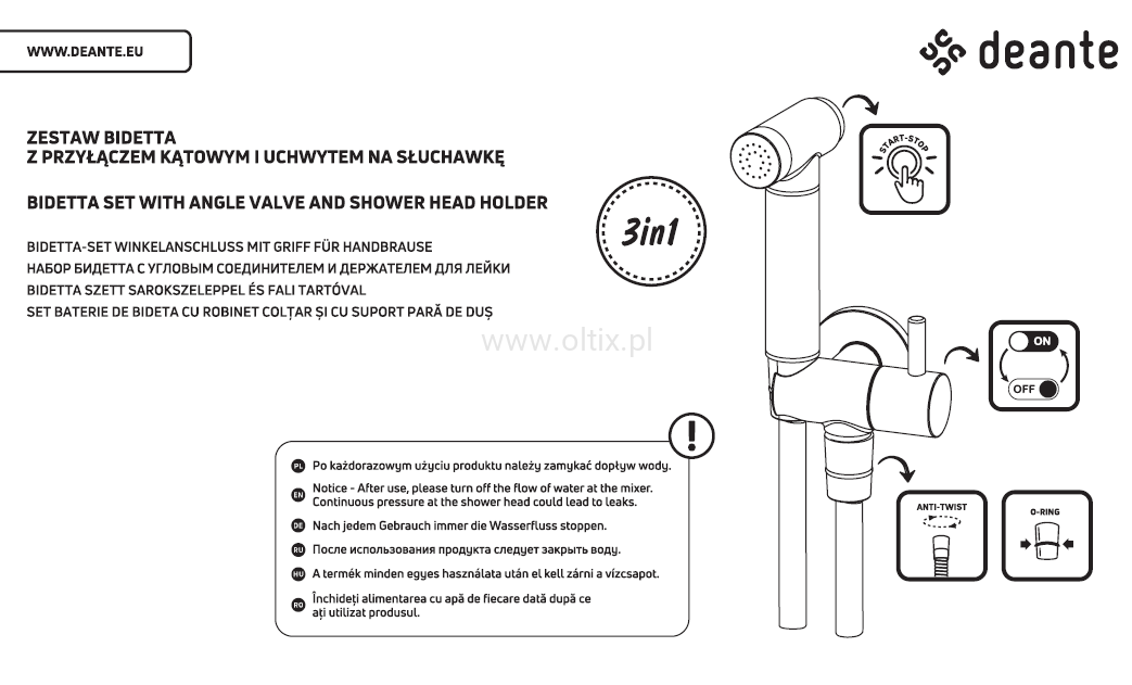 Zestaw bidetta punktowy z przyłączem kątowym - uchwyt na słuchawkę Deante Bidetta ANW N51B