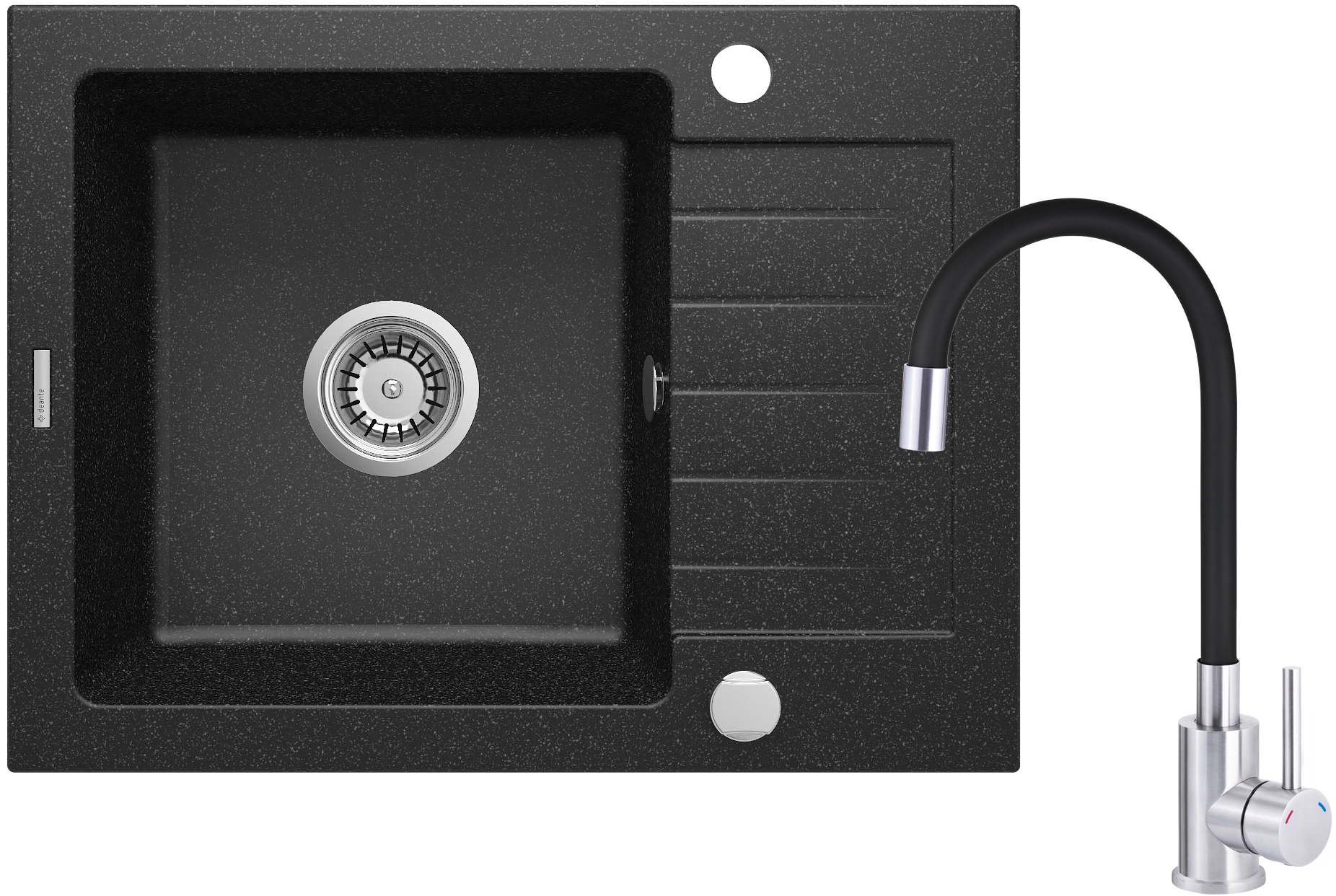 Zlew granitowy Zorba wraz z elegancką baterią to idealny zestaw do kuchni. Zlewozmywak wykonany z trwałego granitu, posiada jedną przestronną komorę i krótki ociekacz. Jego grafitowa barwa wspaniale kontrastuje z jasnymi, kamiennymi lub kompozytowymi blatami, tworząc minimalistyczny lub skandynawski wygląd kuchni. Wykonany z wysokiej jakości granitu, zlewozmywak posiada wszystkie zalety tego wyjątkowo trwałego i odpornego materiału. Jest odporny na przebarwienia, zarysowania, szok termiczny i uderzenia. Dodatkowo jego powierzchnia jest hydrofobowa, co ułatwia utrzymanie produktu w czystości. Bateria natomiast posiada elastyczną wylewkę, która jest bardzo praktyczna podczas prac kuchennych. Ponadto wyposażona jest w aerator, napowietrzający strumień wody, co przyczynia się do oszczędności tego cennego surowca.