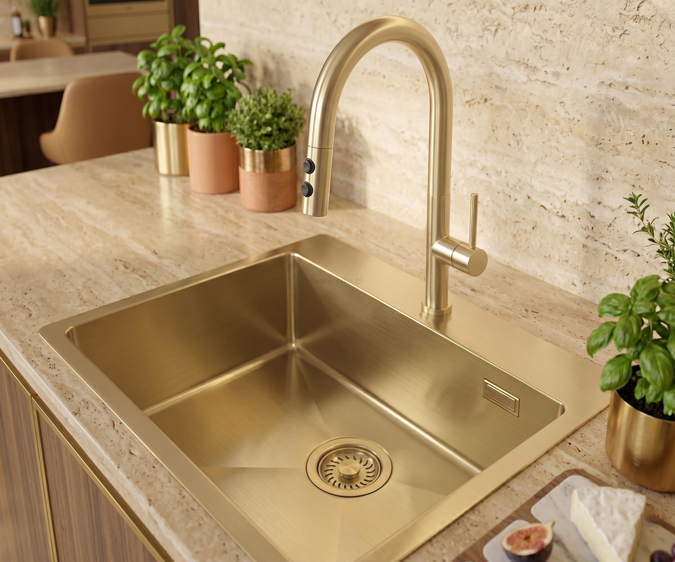 Zlewozmywak OLFATO PRECIOUS, wykonany z wytrzymałej stali nierdzewnej o grubości 0,8 mm, wyróżnia się złotym szczotkowanym wykończeniem. Doskonale pasuje do nowoczesnych kuchni oraz tych w stylu glamour czy boho. Stal, z której powstał OLFATO PRECIOUS, nie ulega korozji, jest odporna na ekstremalne temperatury oraz przebarwienia, nie absorbuje nieprzyjemnych zapachów i ma właściwości antybakteryjne. Model ten pozwala na trzy opcje montażu: wpuszczany, na równi z blatem lub podblatowy. Zlewozmywak stalowy pozwala na samodzielne wykonanie otworu na baterię w wybranym miejscu bez utraty gwarancji, pod warunkiem użycia odpowiedniego narzędzia do stali nierdzewnej (np. wykrojnika). Rozwiązanie zapewnia elastyczność montażu. Gwarancja nie obejmuje uszkodzeń powstałych w wyniku niewłaściwych narzędzi, błędów montażowych lub nieprawidłowego wykonania otworu.